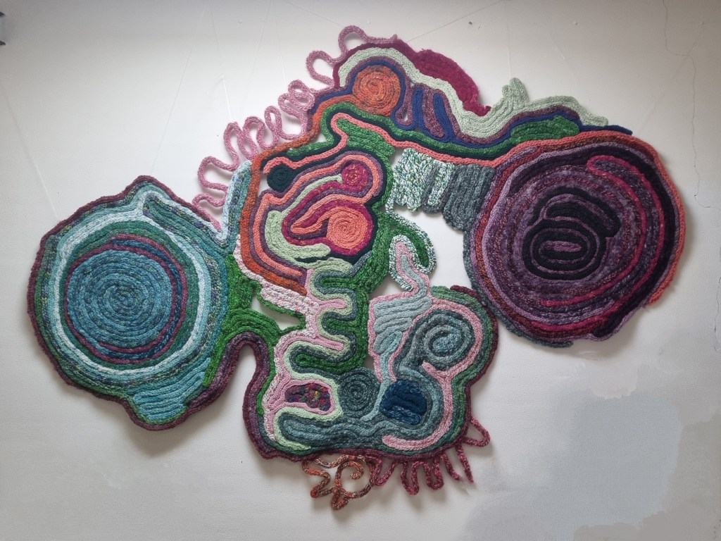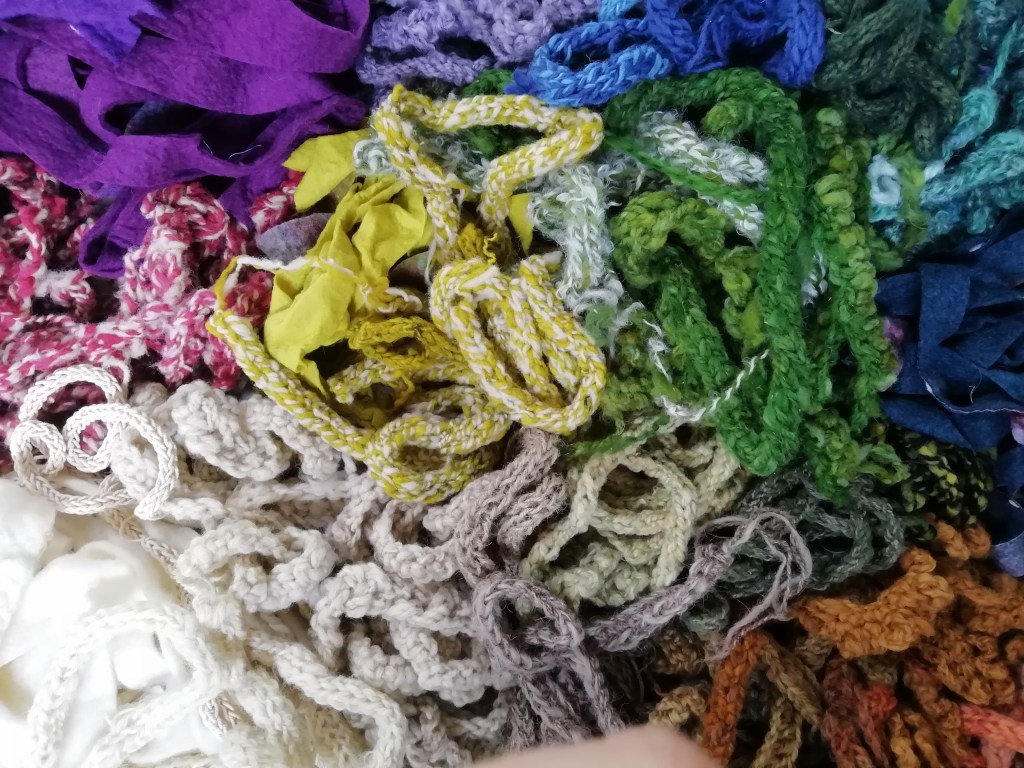 I spent the first three months of this year just spoolknitting and crocheting cords. An ideal job to do in front of the TV or during boring Zoom meetings! The result was this: a huge amount of material to make a work of art out of.