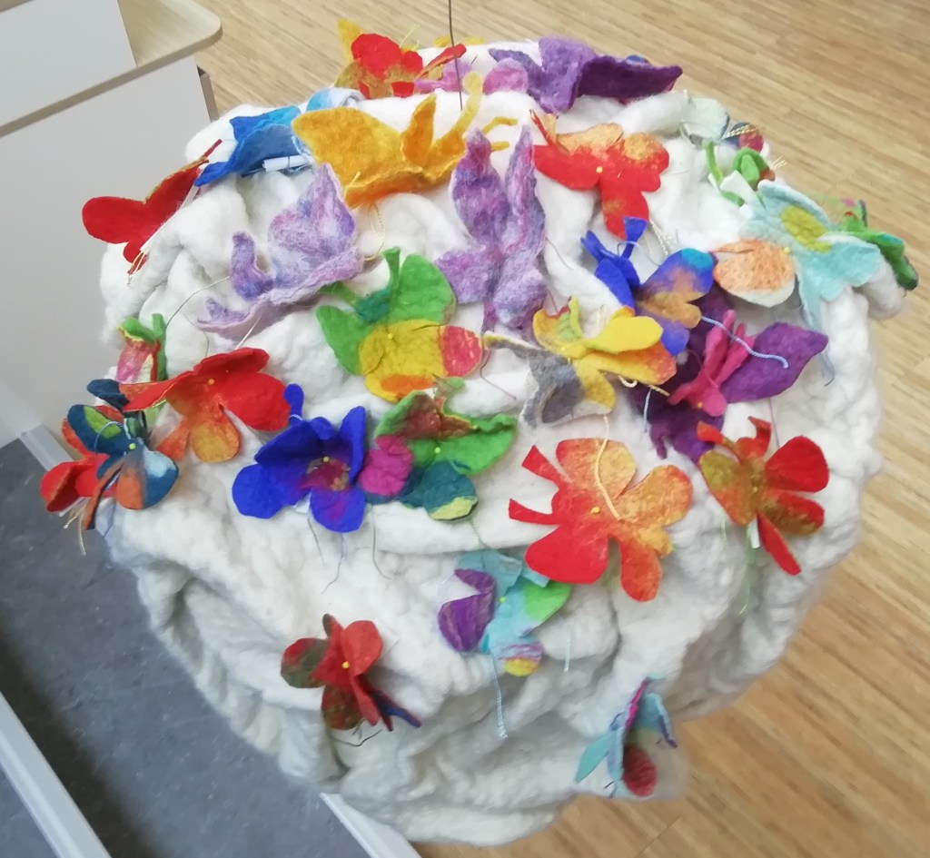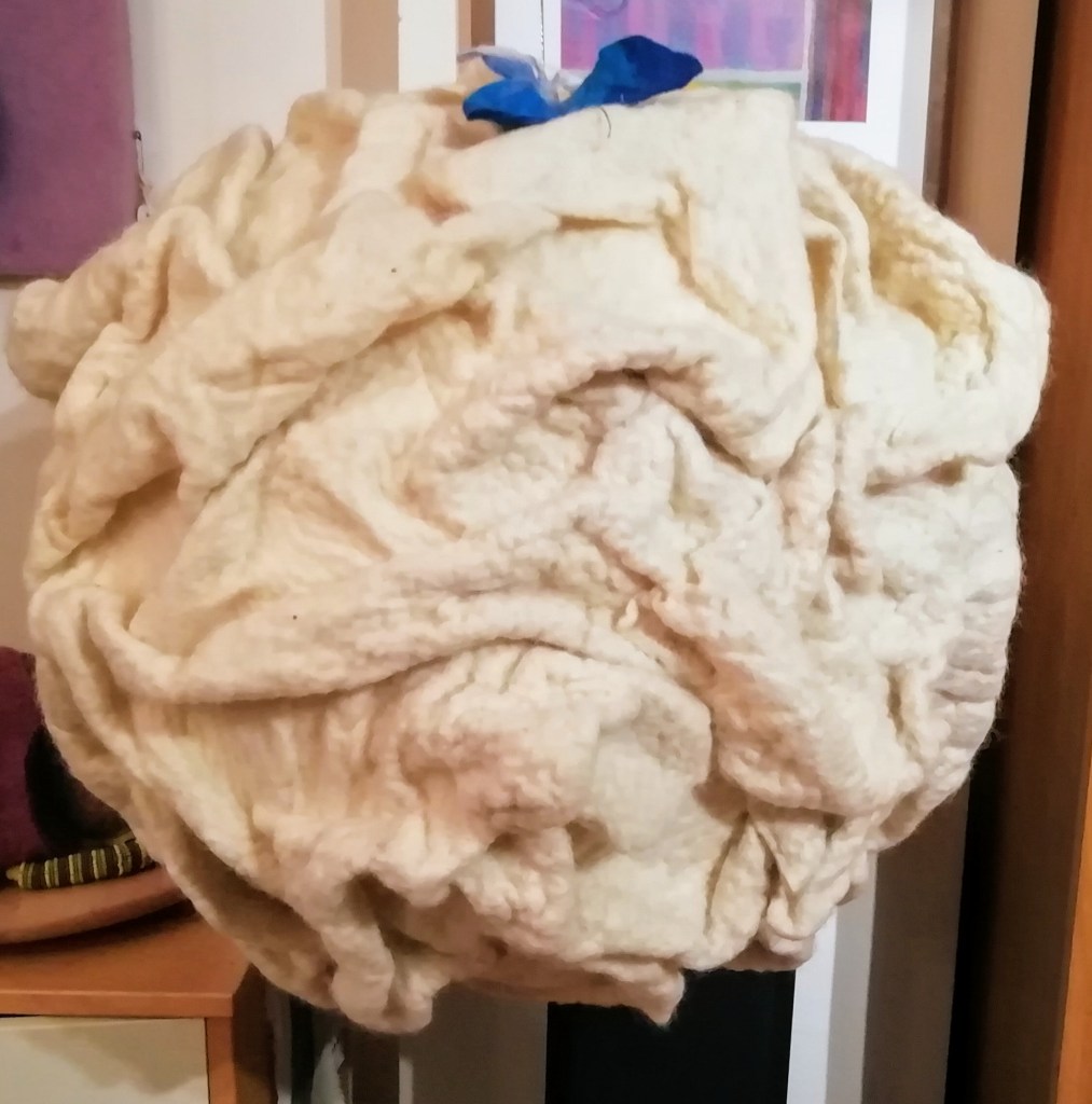 On a styropor ball with a diameter of 50 cm I glued a piece of felt. The original size of the raw sheep’s wool I laid out was 150 x 450 cm. With a felt machine I made a piece of felt, which I crumpled into each other so that folds (mountains and valleys shall we say) arose. These I have sewn on the back, after which the whole is glued to the ball with bookbinder’s glue.