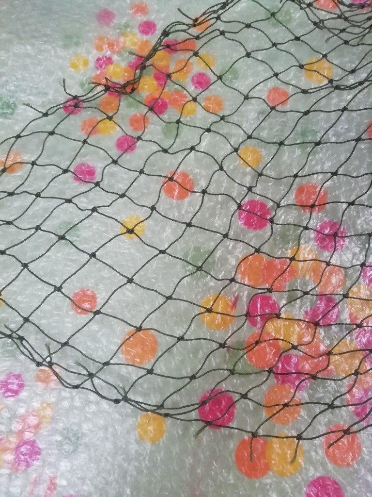 This net is made of polyester and has holes measuring 3×3 cm. It is ideal for weaving in although I must say that you have to put some effort into making the holes lie straight, it pulls somehow.
