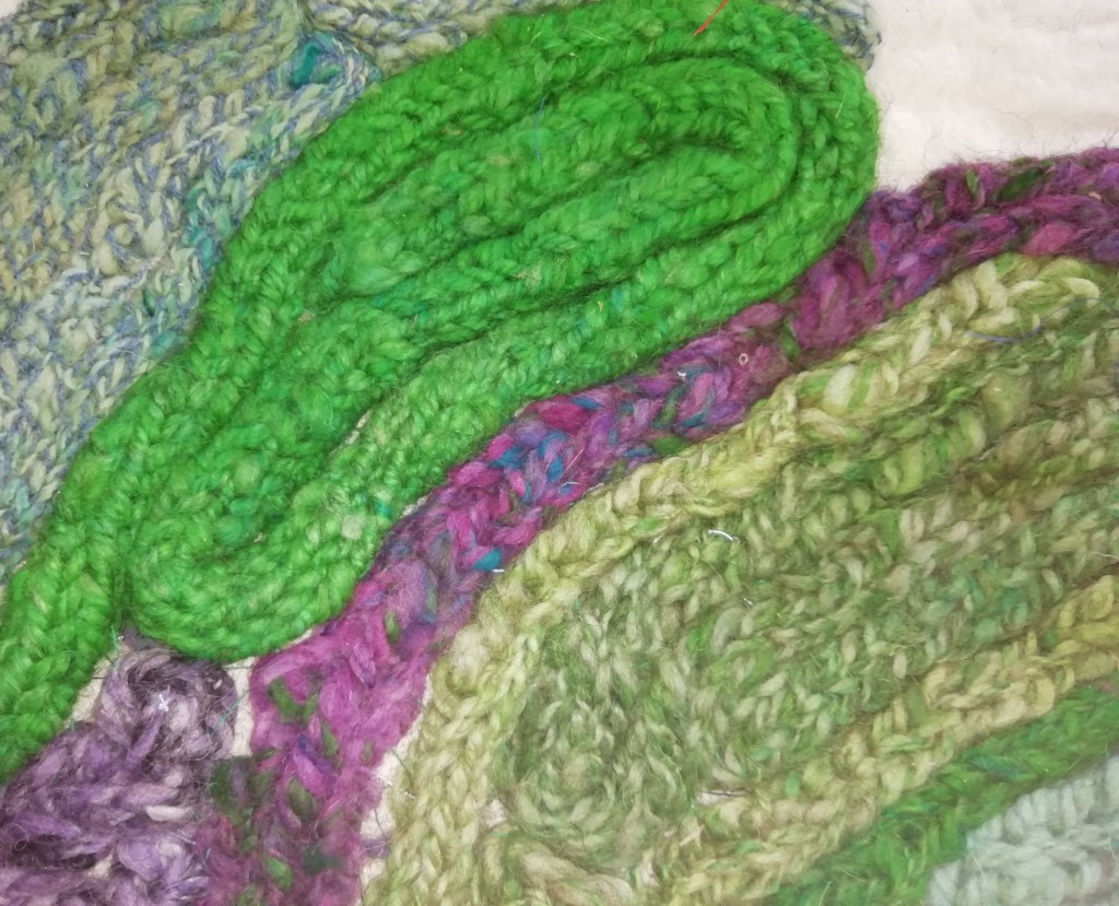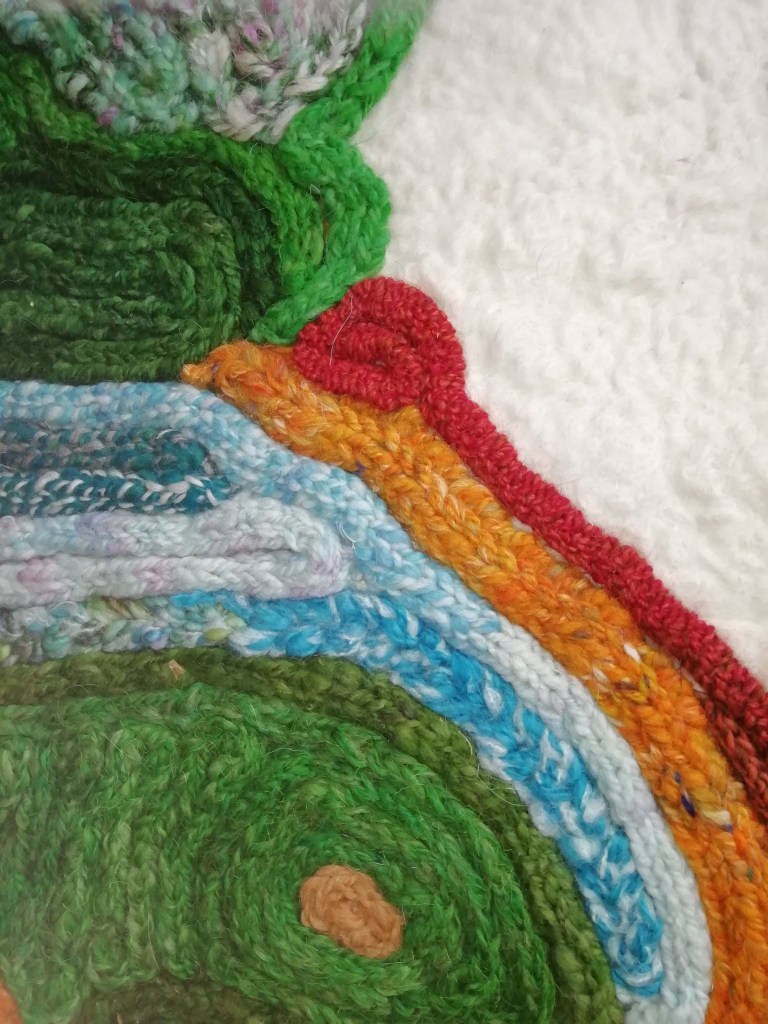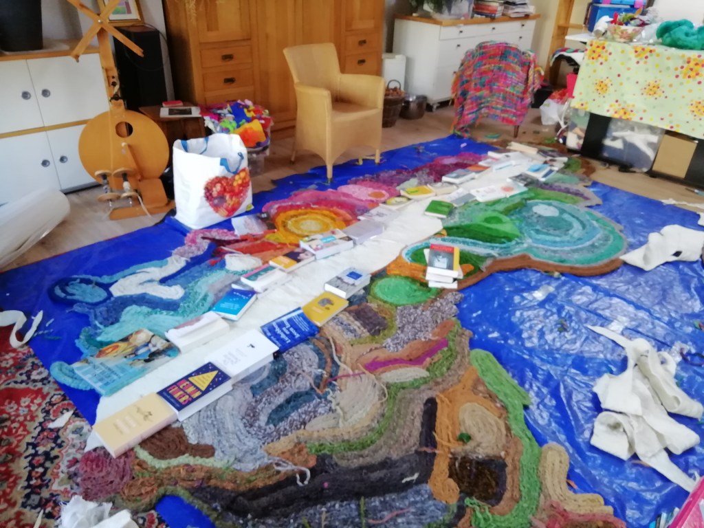 I did get myself into something with this work! The glue I tried to stick the backing with was not strong enough (possibly I used felt that was too thick: 3 mm) so I had to stitch it all the way through by hand. I had to rearrange my studio to use a large wall. Moreover, hanging it was not exactly easy: it is heavy on the one hand and not straight on the other. I attached two steel posts behind it. Chicken wire holds up the top edge.